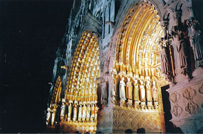 illuminée par des projecteurs de couleurs, voulant recréer l'apparence qu'elle avait lors du Moyen-âge. |