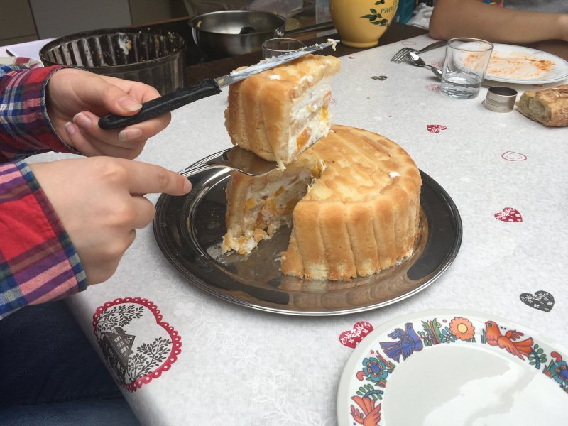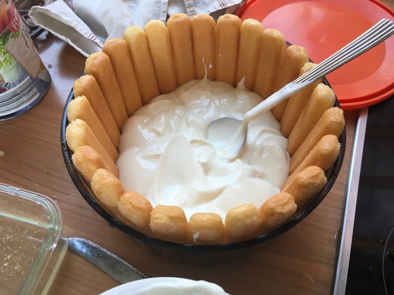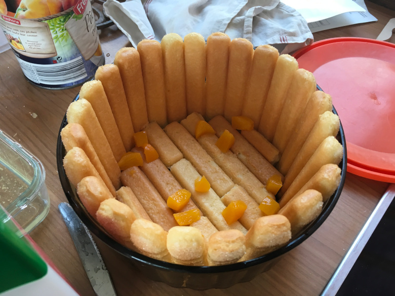 Romane à la manœuvre : il faut de la crème, des pêches, des boudoirs et le bon plat ;-)